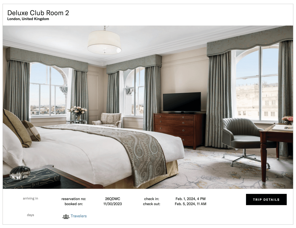 We stayed at the Langham London last New Year’s as a family and this property is quite possibly our favorite hotel in the world. Seriously. It’s so British, so luxurious, and able to maintain a universally appealing vibe. What puts this property over the top, however, is the Langham Club Lounge. Oh my goodness. This is my happy place. But wait, this is not about the properties themselves, it’s about how you can put together amazing dream vacations with Inspirato. Tune in during our travels in February and I’ll share all about the Langham Club Lounge. If you’ve experienced it, you already know. Below is our actual reservation on Inspirato Pass. This trip cost 15 Pass Days…a fantastic value, especially considering that all Inspirato reservations include the Langham Club Lounge. I’m not going to explain Inspirato Pass and how Pass Days work here, but you can read all about it here.