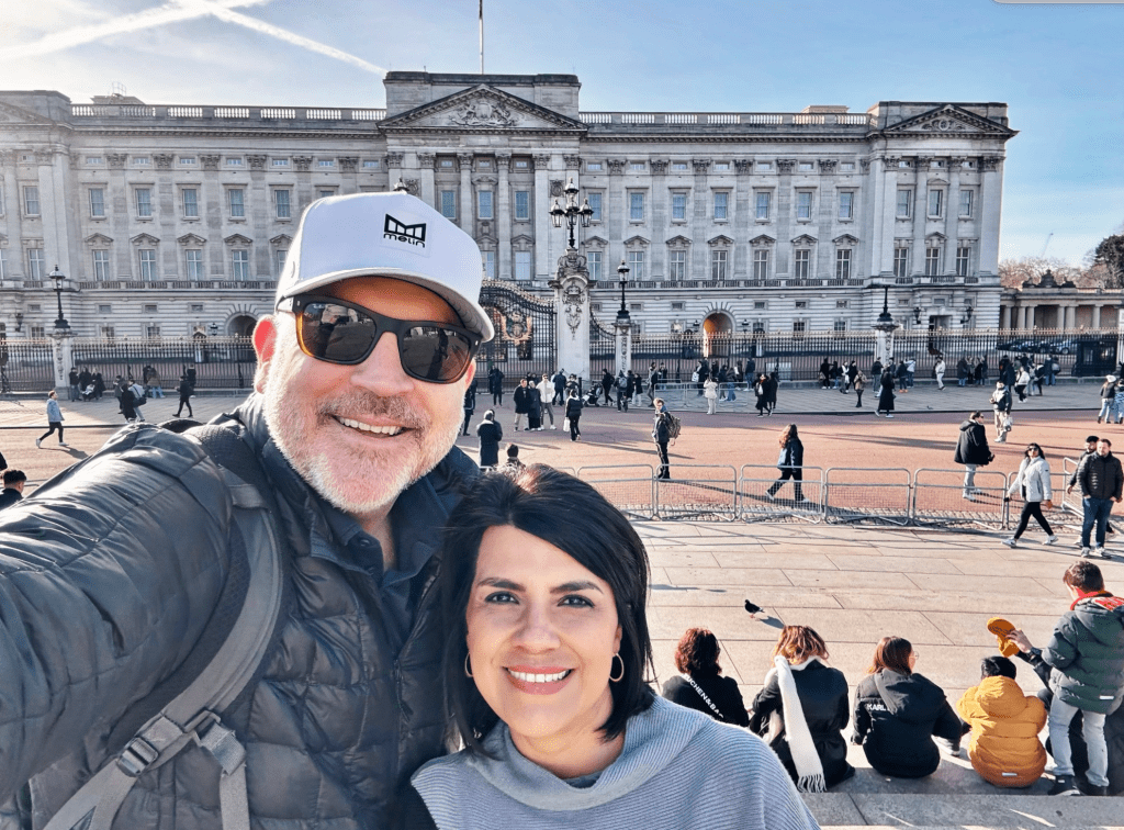 A surprisingly sun shiny morning greeted us this day, always a welcome yet rare occurrence in London in winter. It was a perfect day to lace up the walking shoes and hit the streets. I know I’ve mentioned this from previous Inspirato trips to NYC, but walking around the leading urban centers of the world is my favorite way to explore. Taking in the sites, sounds, and smells (which turn out to be much more pleasant in London than NYC) gives you unique access to the heartbeat of a city. For my wife and I, today that meant walking a total of over 7 miles. It was lovely. You can see the sun shiny sky in the photo of the two of us strolling around Buckingham Palace area.