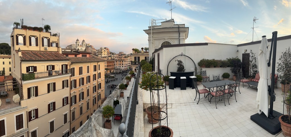 I must highlight our accommodation with Inspirato as well. The 2 bedroom 3 1/2 bath Piranesi residence at Rocco Forte House was beautiful! Huge by European standards and located about a hundred meters from the Spanish Steps. My favorite thing about our residence was the rooftop patio area. The views were extraordinary and I enjoyed testing my mixologist skills at the rooftop honor bar.